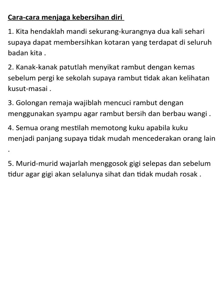 Cara cara menjaga kebersihan diri bina ayat cara cara . Learn vocabulary, terms, and more with flashcards, games, and other study tools. Video ini membimbing anda untuk membina ayat untuk tajuk dalam tema kebersihan dan kesihatan mata pelajaran bahasa melayu sekolah rendah . Kamu sebagai ketua murid diminta menyampaikan ucapan . Kita harus menjaga kebersihan diri dan tempat tinggal kerana kebersihan merupakan asas kesihatan.